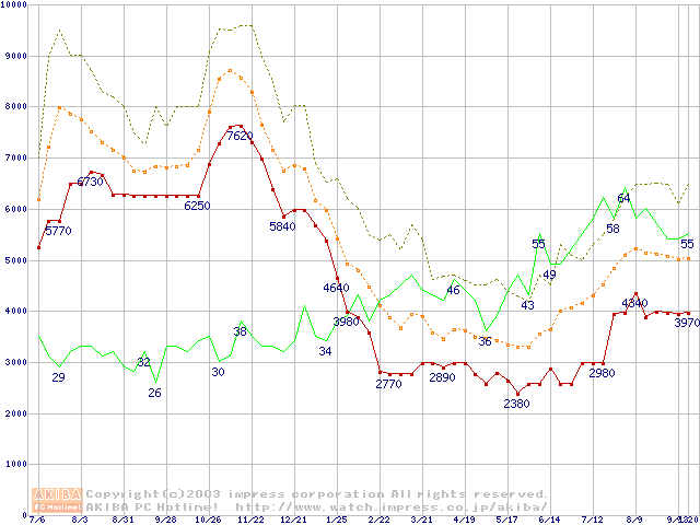PC2700(DDR333) DDR SDRAM DIMMの最安値推移