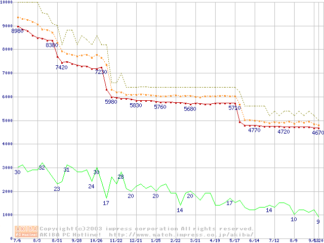 Socket 370 (FC-PGA2,FSB 100MHz,L2 256KB,Tualatin)の最安値推移