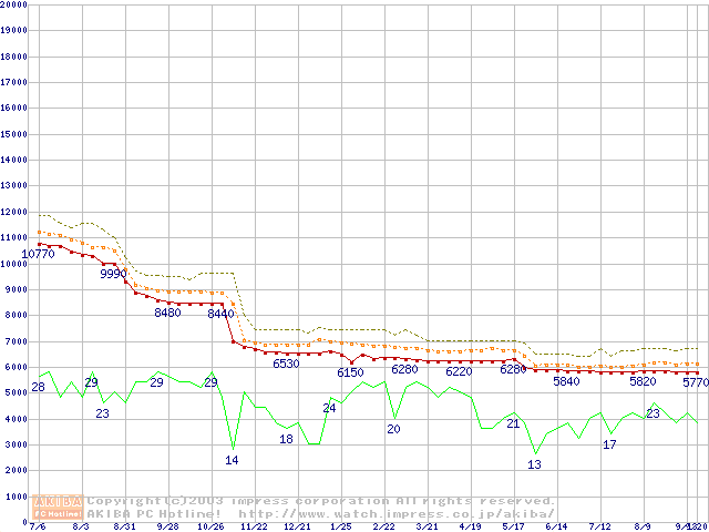 Socket 370 (FC-PGA2,FSB 100MHz,L2 256KB,Tualatin)の最安値推移