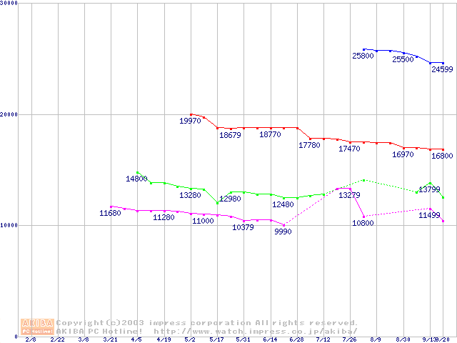 | [↑前グラフ]: | MKシリーズ (9.5mm,4200rpm,2MB,FDB,20GB/Platter)の最安値推移 |
