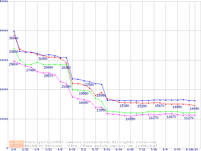 | [↓次グラフ]: | Socket A (OPGA,FSB 266MHz,L2 256KB,Thoroughbred)の最安値推移 |