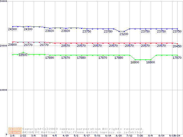 | [↑前グラフ]: | Socket 478 (micro-PGA,FSB 400MHz,L2 128KB,Willamette)の最安値推移 |