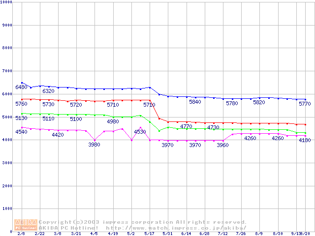 | [↑前グラフ]: | Socket 370 (FC-PGA,FSB 133MHz,L2 256KB,Coppermine)の最安値推移 |