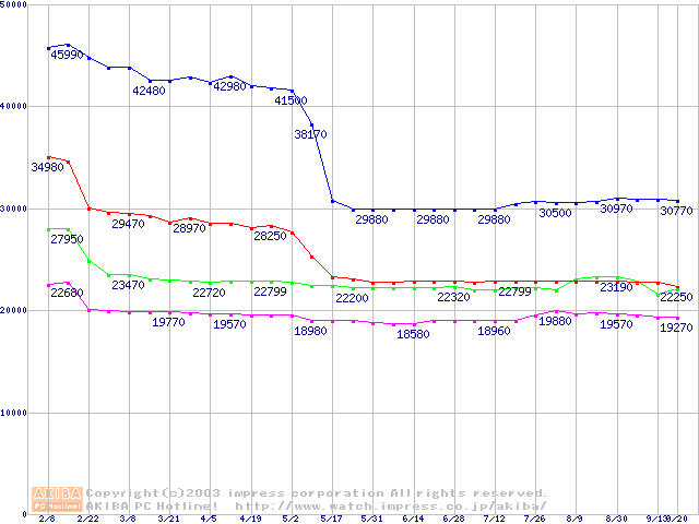 | [↑前グラフ]: | Socket 478 (micro-PGA,FSB 533MHz,L2 512KB,Hyper-Threading,Northwood)の最安値推移 |