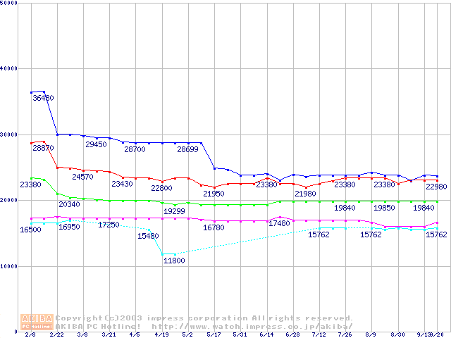 | [↑前グラフ]: | Socket 478 (micro-PGA,FSB 533MHz,L2 512KB,Northwood)の最安値推移 |