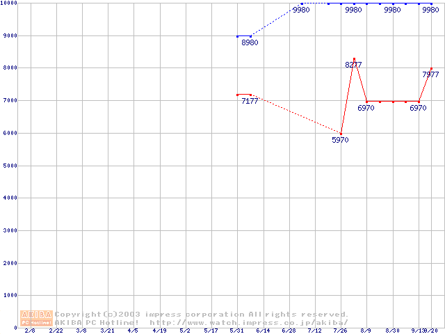 | [↓次グラフ]: | PC2700(DDR333) DDR SDRAM DIMM ECC対応 Registeredタイプの最安値推移 |