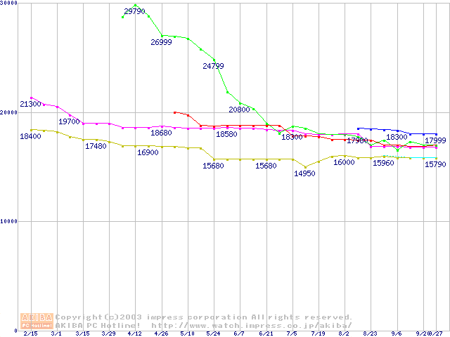 | [↓次グラフ]: | 2.5インチHDD主要製品(最安値2万円~3万円未満)の最安値推移 |