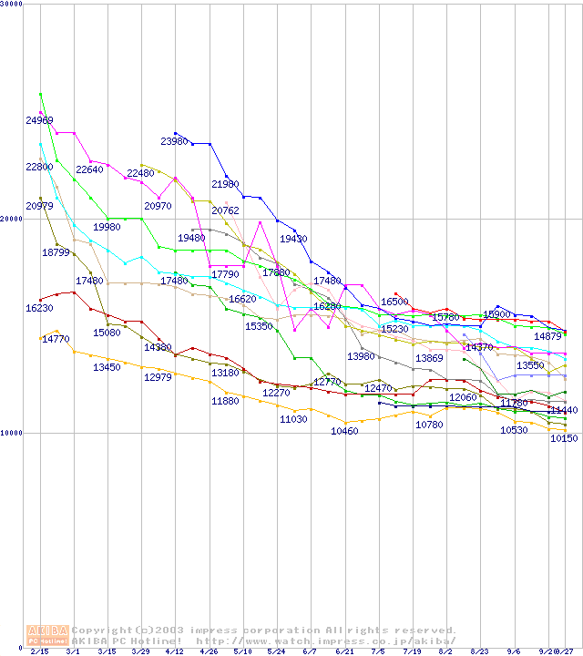 HDD主要製品(最安値1万5千円~2万円未満)の最安値推移