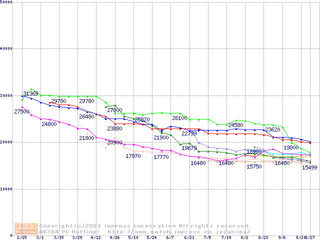 HDD主要製品(最安値1万5千円~2万円未満)の最安値推移