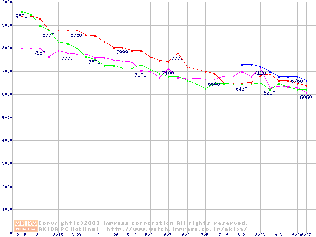 | [↓次グラフ]: | HDD 60GB~80GB未満(7200rpmクラス)の最安値推移 |