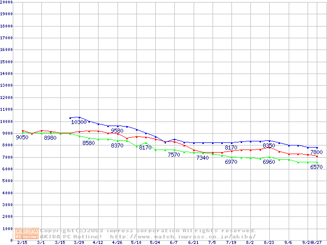 | [↑前グラフ]: | HDD 40GB~50GB未満(7200rpmクラス)の最安値推移 |