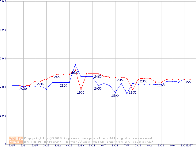 メモリ主要製品(最安値5千円未満)の最安値推移