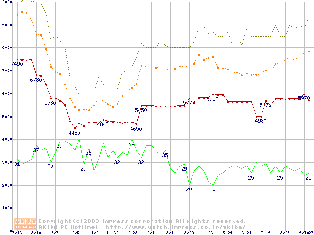 PC133 SDRAM DIMM CasLatency=3の最安値推移