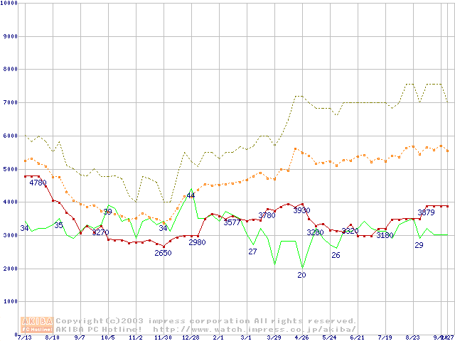 PC100 SDRAM DIMM CasLatency=2の最安値推移