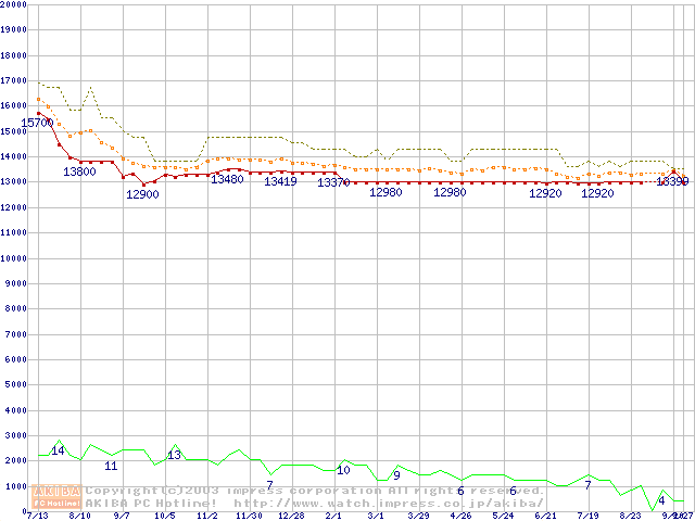 Socket 370 (FC-PGA2,FSB 133MHz,L2 256KB,Tualatin)の最安値推移