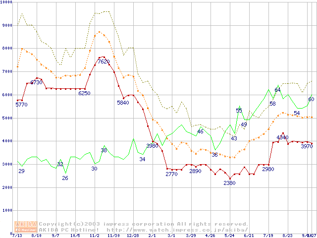 PC2700(DDR333) DDR SDRAM DIMMの最安値推移