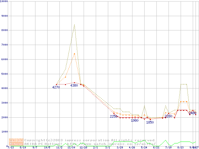 PC2700(DDR333) DDR SDRAM DIMMの最安値推移