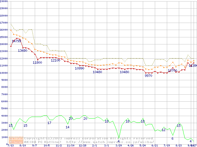 Travelstar 40GNX (9.5mm,5400rpm,UltraATA/100,8MB,FDB,20GB/Platter)の最安値推移