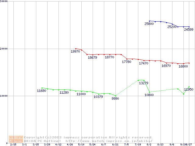 | [↑前グラフ]: | MKシリーズ (9.5mm,4200rpm,2MB,FDB,20GB/Platter)の最安値推移 |