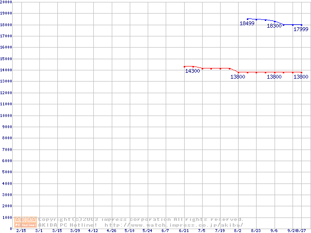 | [↑前グラフ]: | Travelstar 40GN (9.5mm,4200rpm,UltraATA/100,2MB,FDB,20GB/Platter)の最安値推移 |