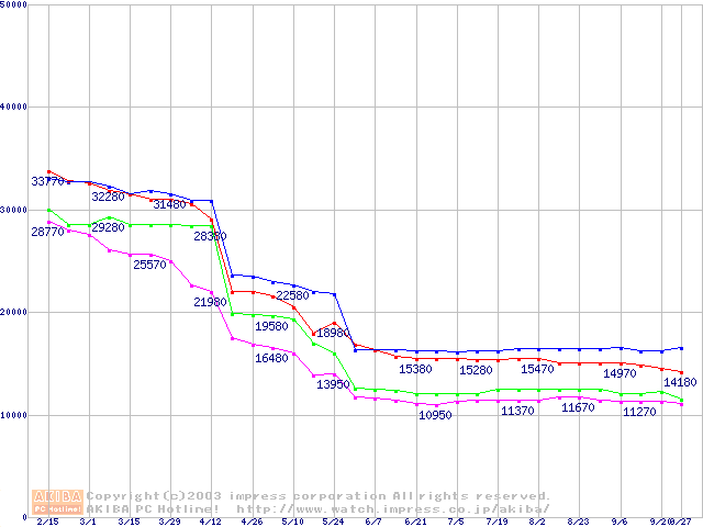 | [↓次グラフ]: | Socket A (OPGA,FSB 266MHz,L2 256KB,Thoroughbred)の最安値推移 |