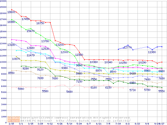| [↑前グラフ]: | Socket A (OPGA,FSB 333MHz,L2 256KB,Thoroughbred)の最安値推移 |