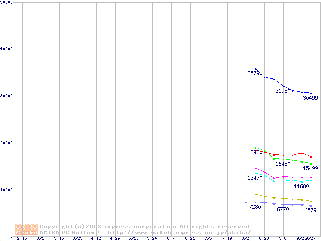 | [↓次グラフ]: | Deskstar 180GXP (7200rpm,8MB,UltraATA/100,FDB)の最安値推移 |