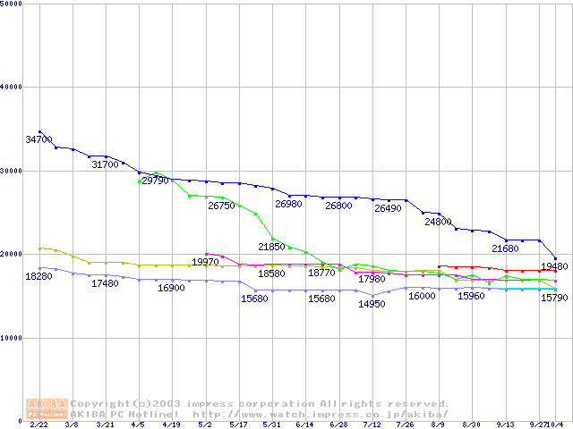 | [↓次グラフ]: | 2.5インチHDD主要製品(最安値2万円~3万円未満)の最安値推移 |