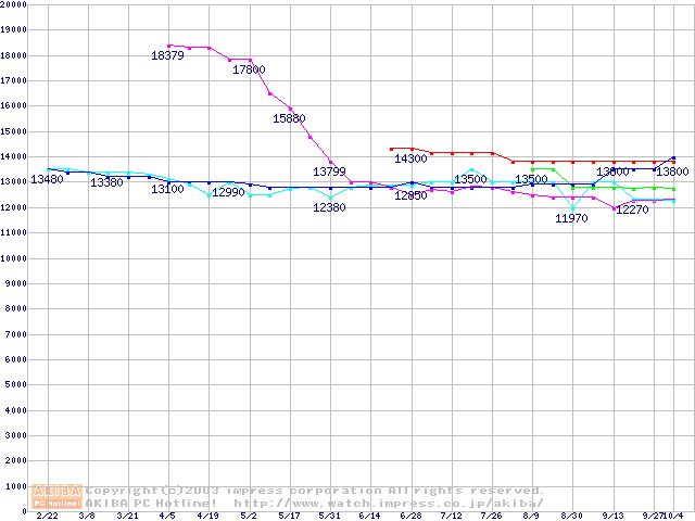 | [↑前グラフ]: | 2.5インチHDD 30GB~40GB未満(9.5mm厚)の最安値推移 |