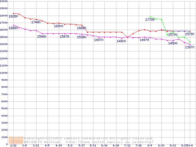 | [↑前グラフ]: | 2.5インチHDD 40GB~50GB未満(9.5mm厚,4200rpm)の最安値推移 |