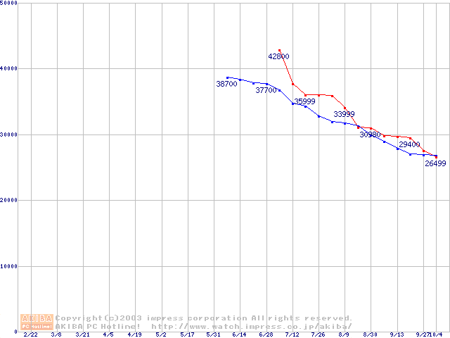 | [↑前グラフ]: | 2.5インチHDD 40GB~50GB未満(9.5mm厚,5400rpm)の最安値推移 |