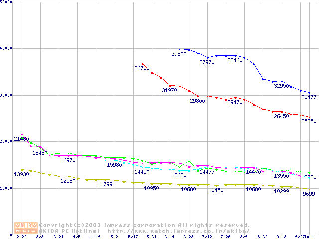 | [↓次グラフ]: | HDD 30GB~80GB未満(7200rpmクラス)の最安値推移 |