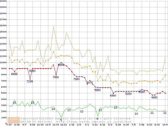 メモリ主要製品(最安値5千円未満)の最安値推移