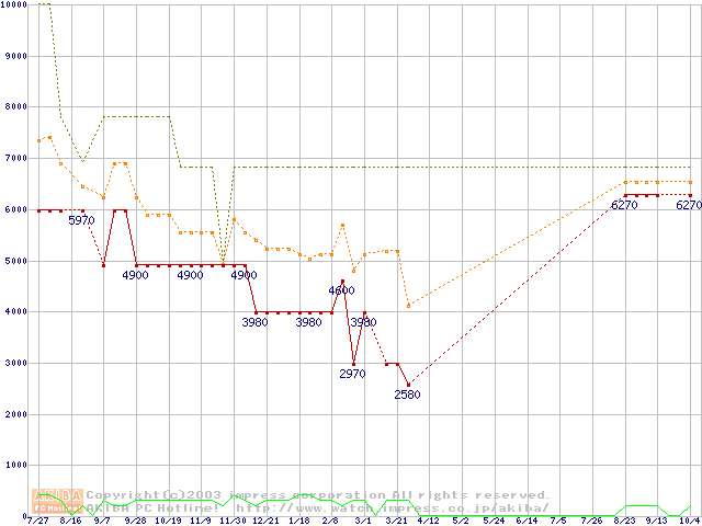 PC100 SDRAM DIMM CasLatency=2 ECC対応 Registeredタイプの最安値推移