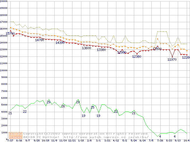 Travelstar 40GN (9.5mm,4200rpm,UltraATA/100,2MB,FDB,20GB/Platter)の最安値推移