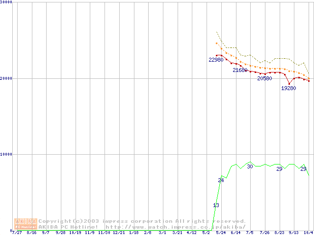 Socket 478 (micro-PGA,FSB 800MHz,L2 512KB,Hyper-Threading,Northwood)の最安値推移