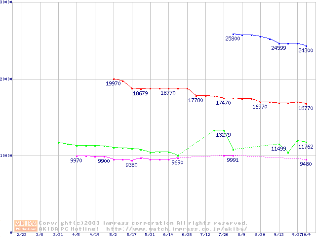| [↑前グラフ]: | MKシリーズ (9.5mm,4200rpm,2MB,FDB,20GB/Platter)の最安値推移 |