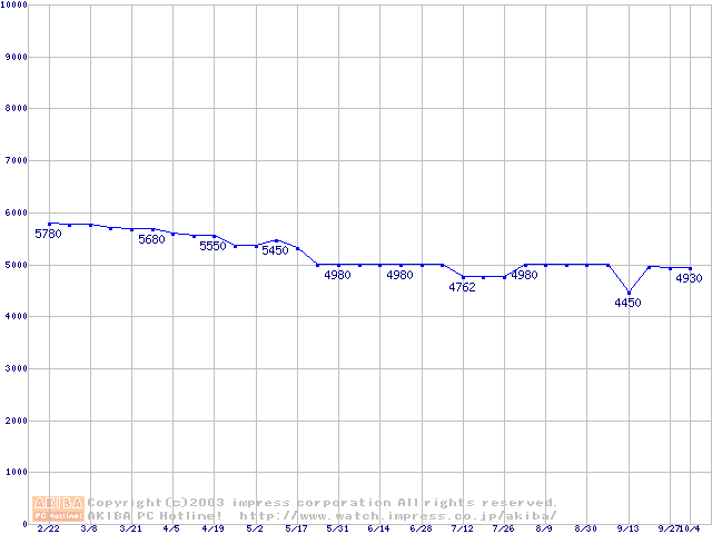 | Socket A (PGA,FSB 266MHz,L2 256KB,Thunderbird)の最安値推移 |