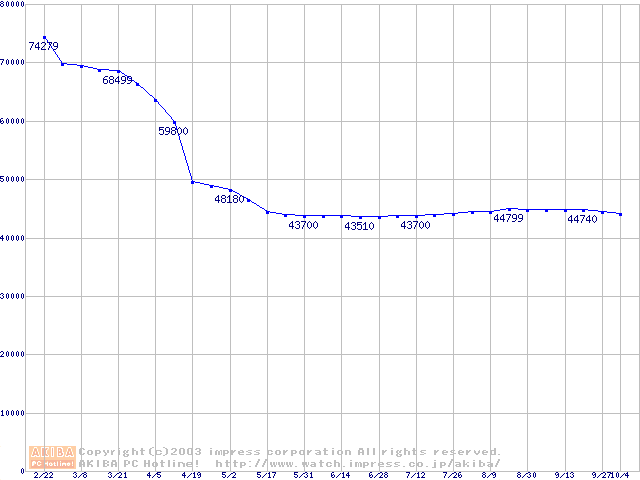 | [↑前グラフ]: | Socket 478 (micro-PGA,FSB 800MHz,L2 512KB,Hyper-Threading,Northwood)の最安値推移 |