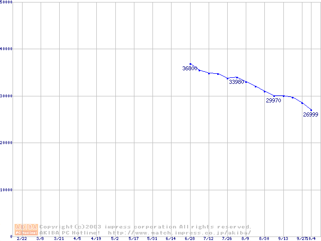| [↑前グラフ]: | Deskstar 180GXP (7200rpm,2MB,UltraATA/100,FDB)の最安値推移 |