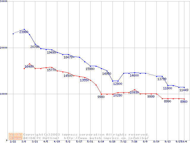 | [↓次グラフ]: | Barracuda 7200.7 (7200rpm,UltraATA/100,8MB,80GB/Platter,FDB)の最安値推移 |