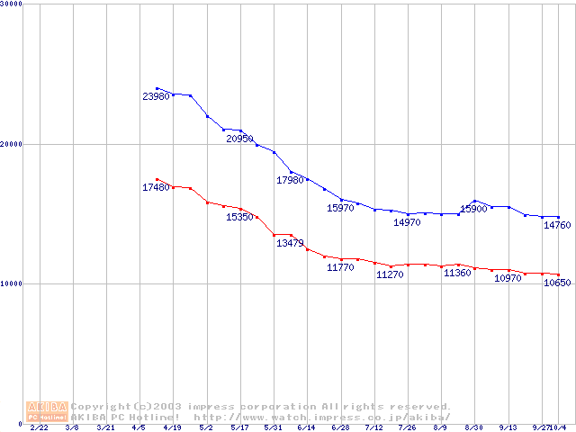 | [↓次グラフ]: | Barracuda 7200.7 (7200rpm,UltraATA/100,2MB,80GB/Platter,FDB)の最安値推移 |