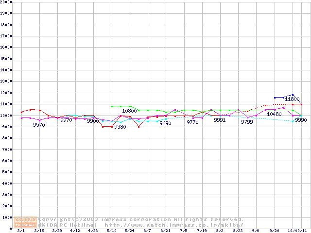 | [↑前グラフ]: | 2.5インチHDD主要製品(最安値3万円以上)の最安値推移 |