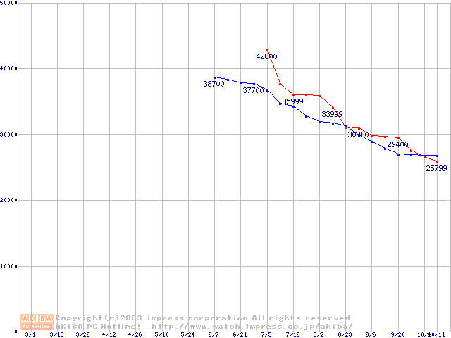 | [↑前グラフ]: | 2.5インチHDD 40GB~50GB未満(9.5mm厚,5400rpm)の最安値推移 |