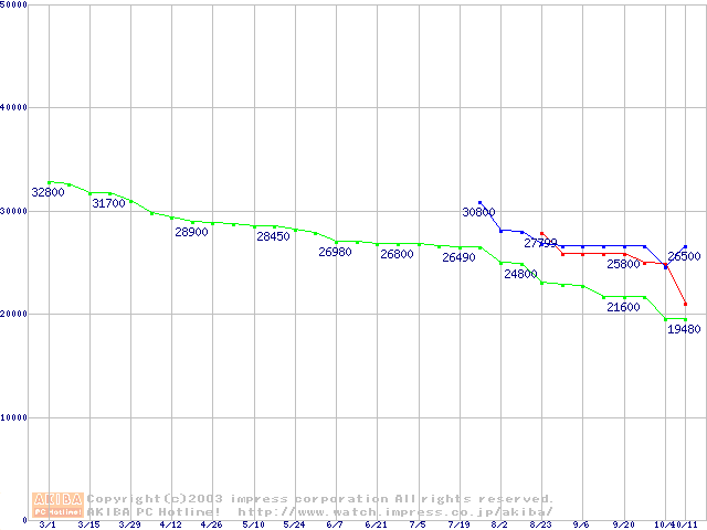 | [↑前グラフ]: | 2.5インチHDD 60GB~80GB未満(9.5mm厚,4200rpm)の最安値推移 |