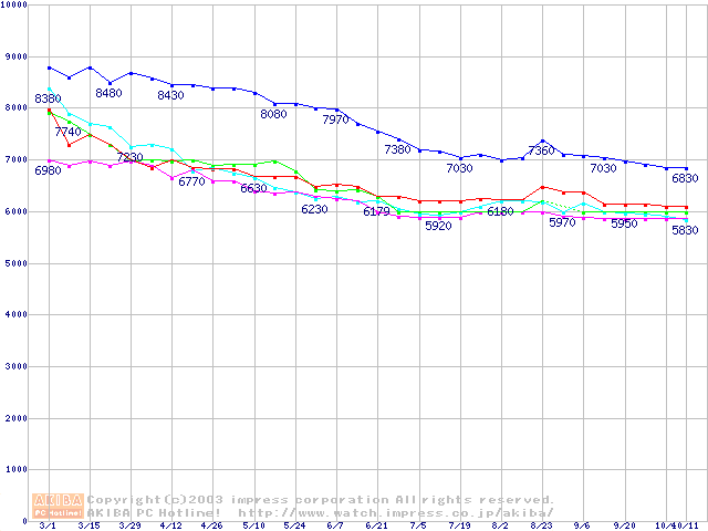 | [↑前グラフ]: | HDD 20GB~30GB未満(5400rpmクラス)の最安値推移 |