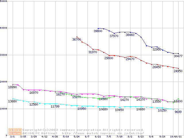 | [↓次グラフ]: | HDD 30GB~80GB未満(7200rpmクラス)の最安値推移 |
