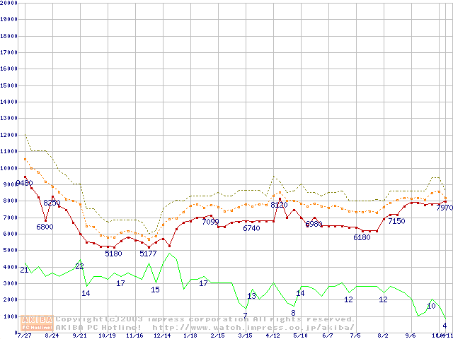 PC133 SDRAM DIMM CasLatency=2の最安値推移