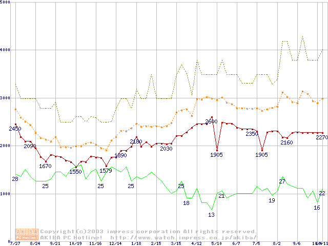 PC100 SDRAM DIMM CasLatency=2の最安値推移