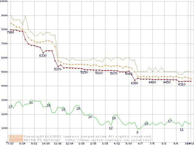 Socket 370 (FC-PGA2,FSB 100MHz,L2 256KB,Tualatin)の最安値推移